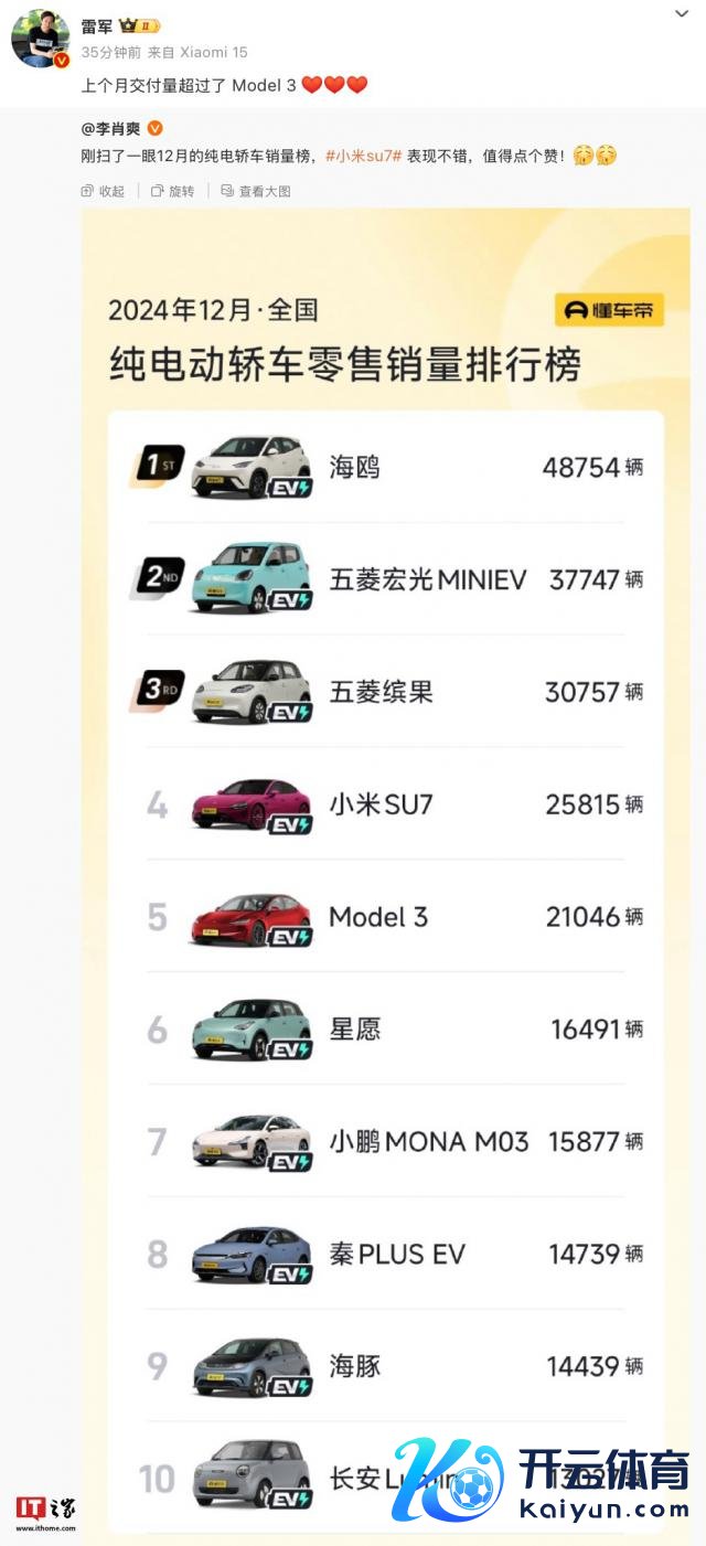 李肖爽贴出的纯电轿车销量榜自大,2024 年 12 月,小米 SU7 销量为 25815 辆,名按次五;特斯拉 Model 3 销量为 21046 辆,名按次六。排在前三的远离为比亚迪海鸥、五菱宏光 MINIEV、五菱缤果。