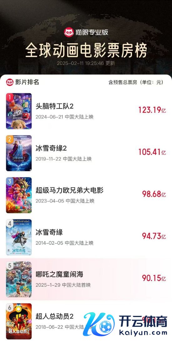 新浪科技讯 2月11日晚间音尘,据猫眼专科版数据,《哪吒之魔童闹海》累计票房(含预售)破90.15亿开云体育,超《超东谈主总动员2》票房收货,插足大家动画电影票房榜前五。